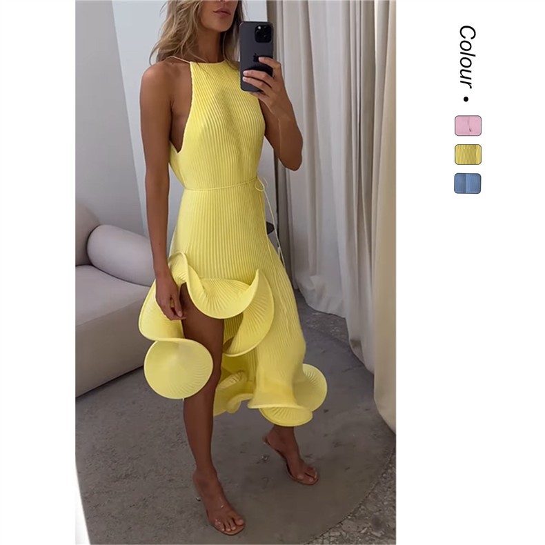 This sleeveless chiffon dress is designed for warm days and easy elegance. The soft, breathable fabric feels light on the skin, while the adjustable waist creates a flattering silhouette that moves with you. Finished with a modern high neckline and a flowing mid-length skirt, it’s perfect for both casual and dressed-up moments.
